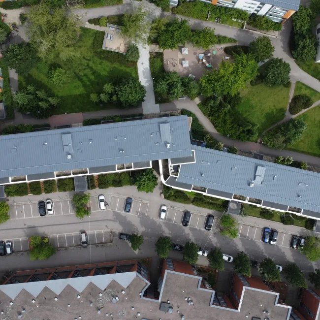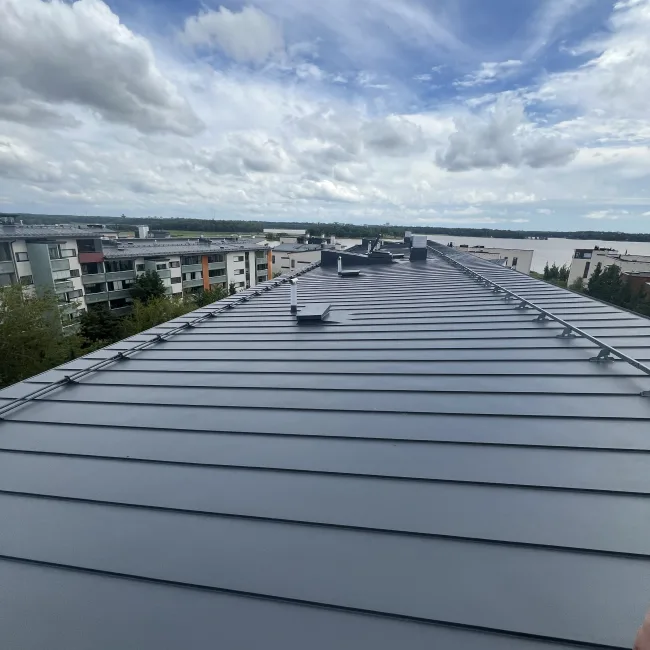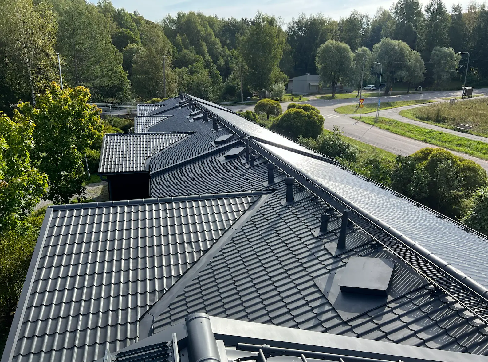Tässä kohteessa toteutimme taloyhtiön n. 1500m2 konesaumattujen peltikattojen huoltomaalauksen pensselimaalauksena.