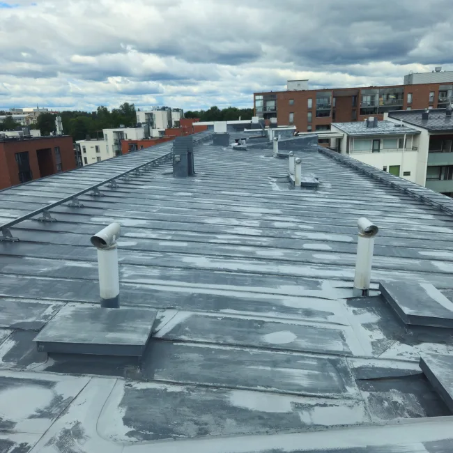 Tässä kohteessa toteutimme taloyhtiön n. 800m2 peltikaton uudelleenpinnoituksen 2-komponenttipinnoitteella.