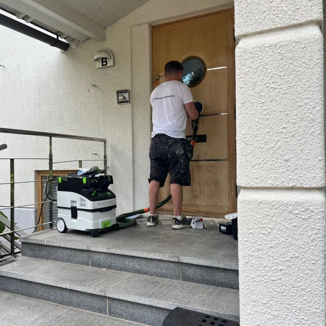 Tässä kohteessa toteutimme taloyhtiön tammi-ikkunoiden ja ovien huoltolakkaustyöt.
